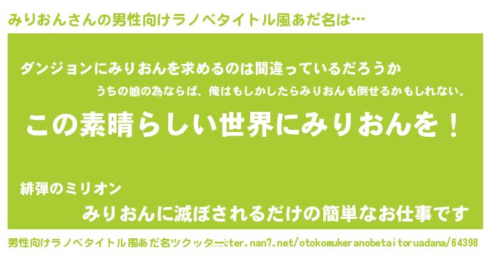 | 女子向けラノベタイトル風あだ名 | 『悪役みりおんに転生したようですが、知った事ではありません』 |