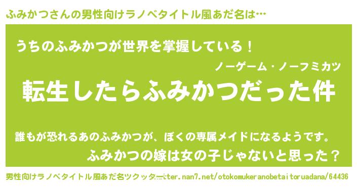 | 女子向けラノベタイトル風あだ名 | 『ふみかつの玉の輿計画!』 |
