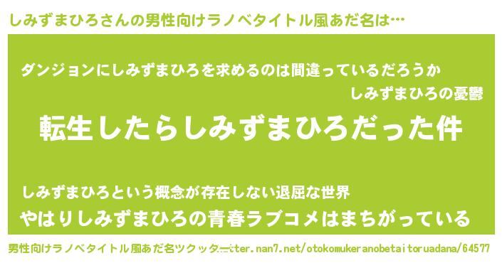 | 女子向けラノベタイトル風あだ名 | 『しみずまひろの玉の輿計画!』 |