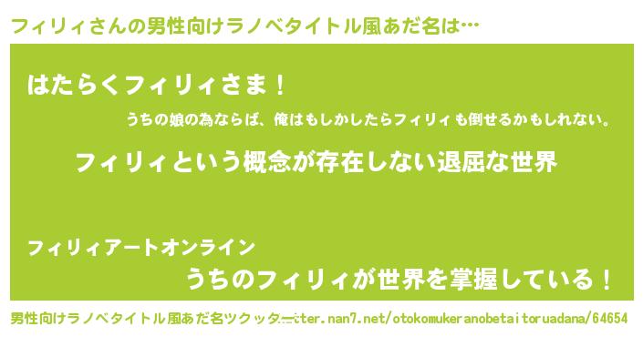 | 女子向けラノベタイトル風あだ名 | 『異世界で失敗しない100のフィリィ』 |