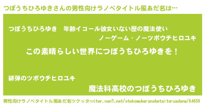 | 胡散臭い通販商品みたいなあだ名 | 『あなたにだけ特別に提供する100年もののヴィンテージワイン…その名も「つぼうちひろゆき」』 |
