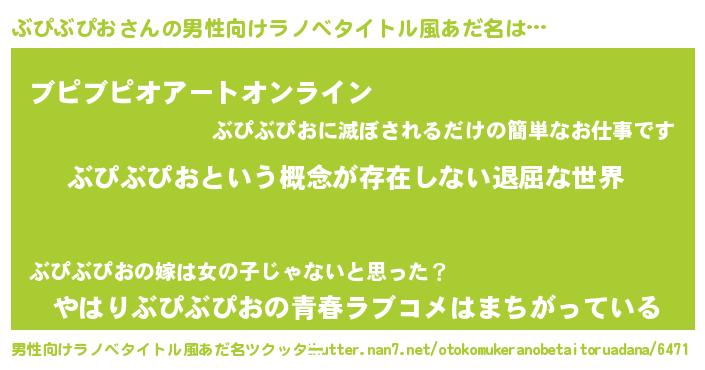| 女子向けラノベタイトル風あだ名 | 『異世界で失敗しない100のぶぴぶぴお』 |