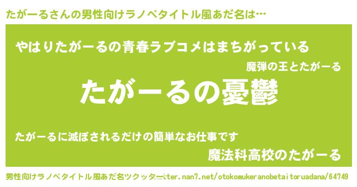 | 女子向けラノベタイトル風あだ名 | 『(仮)たがーるのやんごとなき事情』 |