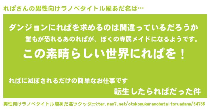 | 女子向けラノベタイトル風あだ名 | 『悪役れぱに転生したようですが、知った事ではありません』 |