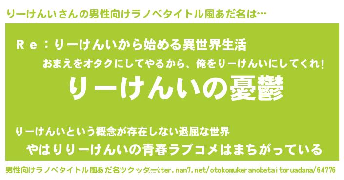 | 女子向けラノベタイトル風あだ名 | 『りーけんい姫と円卓の騎士』 |