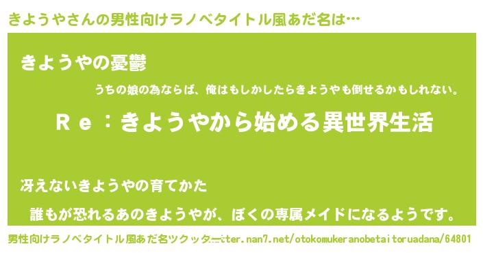 | 肩書あだ名 | 『きようや総統』『きようや御曹司』 |