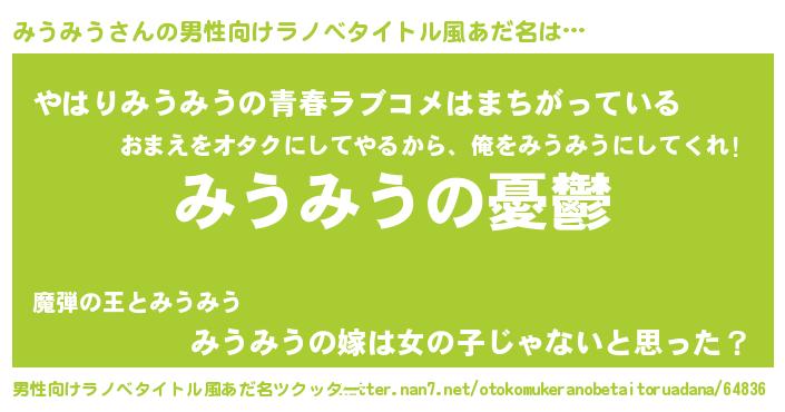 | 女子向けラノベタイトル風あだ名 | 『みうみう姫と円卓の騎士』 |