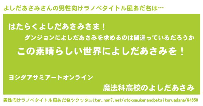 | 女子向けラノベタイトル風あだ名 | 『悪役よしだあさみに転生したようですが、知った事ではありません』 |