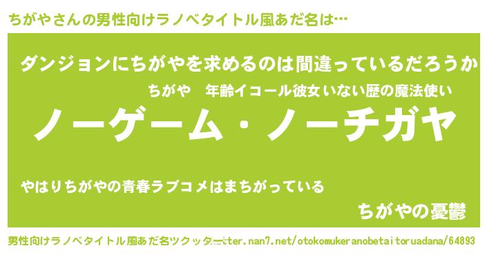 | 女子向けラノベタイトル風あだ名 | 『死神ちがやの再婚』『ちがや伯爵の花嫁』 |