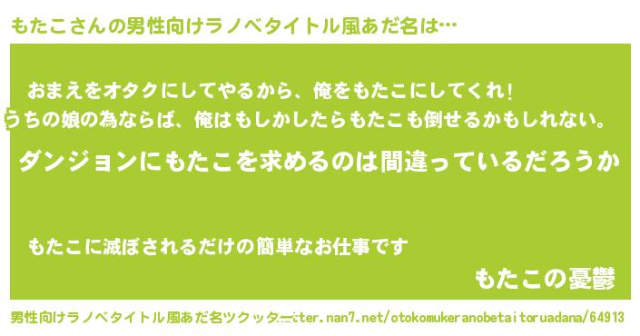 | 女子向けラノベタイトル風あだ名 | 『もたこの卵を拾いまして』 |