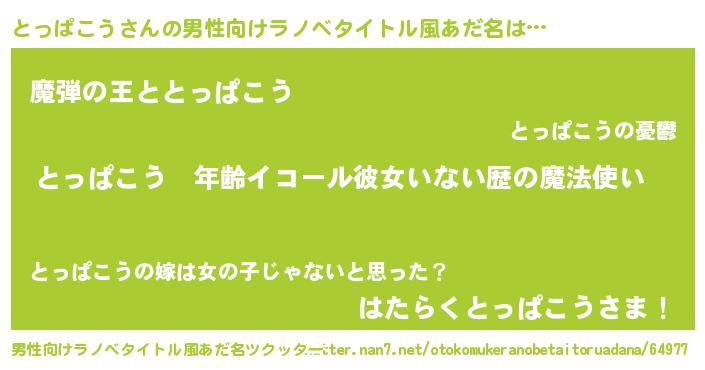 | 女子向けラノベタイトル風あだ名 | 『とっぱこうの玉の輿計画!』 |