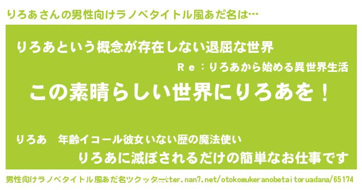| 女子向けラノベタイトル風あだ名 | 『乙女ゲームの破滅フラグしかない悪役りろあに転生してしまった…』 |