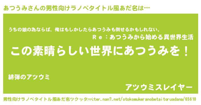 | 意味不明あだ名 | 『住所不定無職あつうみ(89歳)』 |