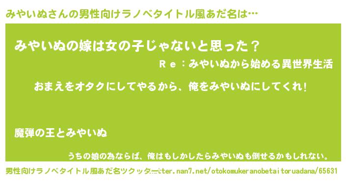 | 女子向けラノベタイトル風あだ名 | 『みやいぬ夫妻のなれそめ』 |