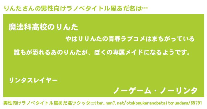 | 女子向けラノベタイトル風あだ名 | 『りんたの契約王妃』『りんた恋絵巻』 |