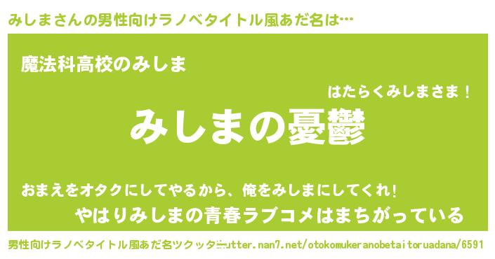 | 女子向けラノベタイトル風あだ名 | 『(仮)みしまのやんごとなき事情』 |