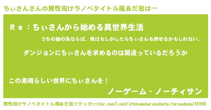 | 女子向けラノベタイトル風あだ名 | 『ちぃさんの卵を拾いまして』 |