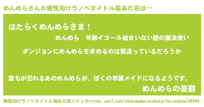 | 女子向けラノベタイトル風あだ名 | 『めんめらの卵を拾いまして』 |