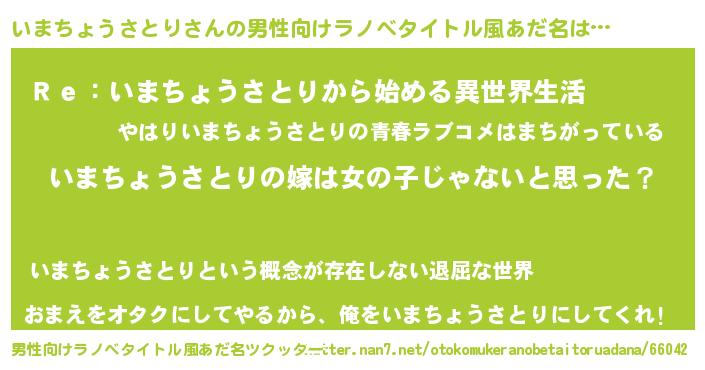 | 女子向けラノベタイトル風あだ名 | 『いまちょうさとりの卵を拾いまして』 |