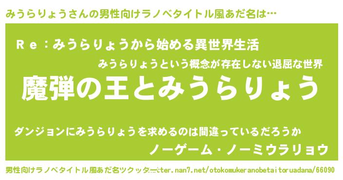 | 女子向けラノベタイトル風あだ名 | 『みうらりょうが死なない童話 林檎のみうらりょうの診療簿』 |