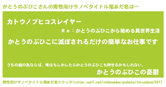 | 胡散臭い通販商品みたいなあだ名 | 『億万長者になれる霊験あらたかなお札…その名も「かとうのぶひこ」』 |