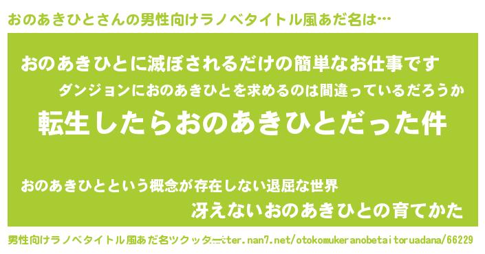 | 女子向けラノベタイトル風あだ名 | 『おのあきひとの玉の輿計画!』 |