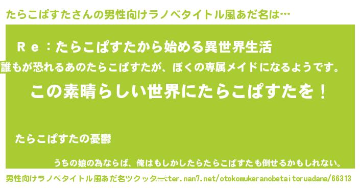 | 女子向けラノベタイトル風あだ名 | 『悪役たらこぱすたに転生したようですが、知った事ではありません』 |