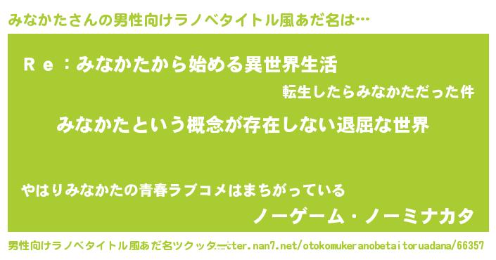 | 女子向けラノベタイトル風あだ名 | 『みなかたの契約王妃』『闇のみなかた』 |