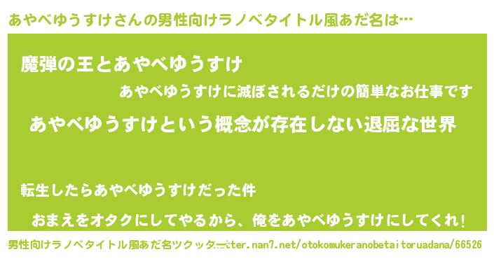 | 女子向けラノベタイトル風あだ名 | 『異世界で失敗しない100のあやべゆうすけ』 |