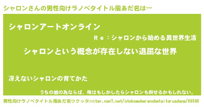 | 女子向けラノベタイトル風あだ名 | 『異世界で失敗しない100のシャロン』 |