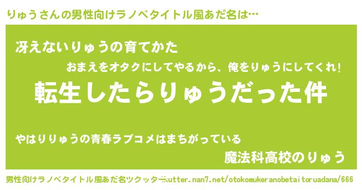 | 女子向けラノベタイトル風あだ名 | 『りゅうの玉の輿計画!』『りゅう恋絵巻』 |
