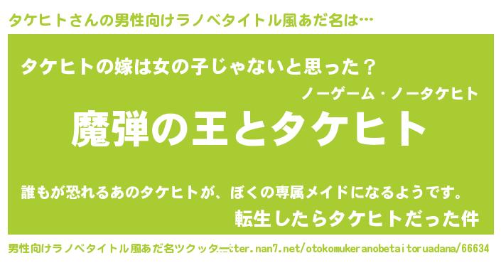 女子向けラノベタイトル風あだ名 | 『タケヒトが死なない童話 林檎のタケヒトの診療簿』 |