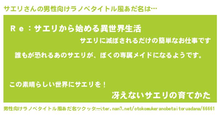 | 女子向けラノベタイトル風あだ名 | 『異世界でカフェサエリを開店しました。』 |