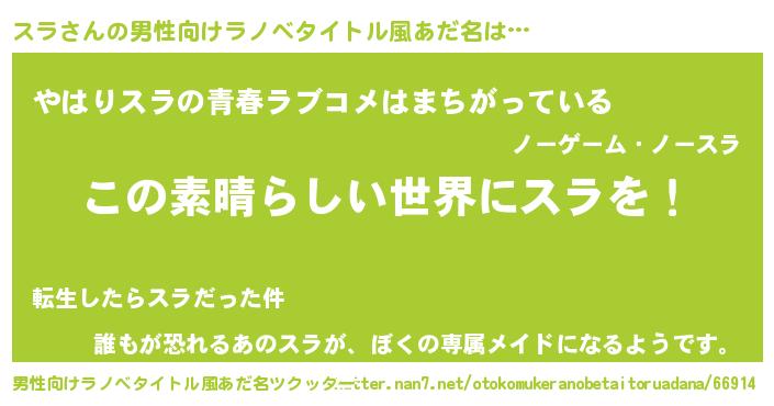 | 女子向けラノベタイトル風あだ名 | 『乙女ゲームの破滅フラグしかない悪役スラに転生してしまった…』 |