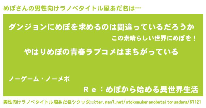 | 女子向けラノベタイトル風あだ名 | 『めぽの雑貨屋さん』『死神めぽの再婚』 |