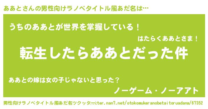 | 女子向けラノベタイトル風あだ名 | 『ああとの玉の輿計画!』 |