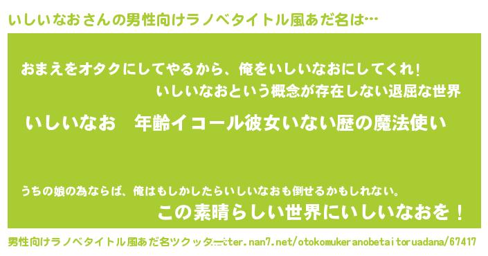 | 女子向けラノベタイトル風あだ名 | 『いしいなおの玉の輿計画!』 |