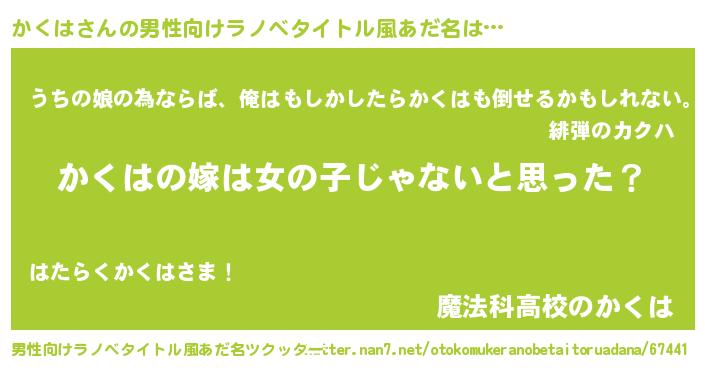 | 女子向けラノベタイトル風あだ名 | 『かくは様がみてる』『かくは伯爵の花嫁』 |