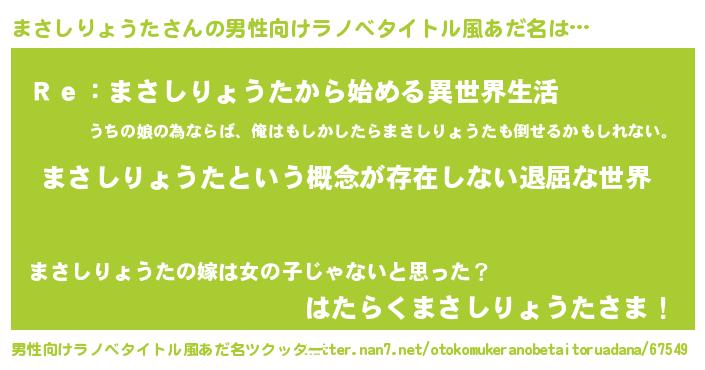 | 女子向けラノベタイトル風あだ名 | 『異世界で失敗しない100のまさしりょうた』 |
