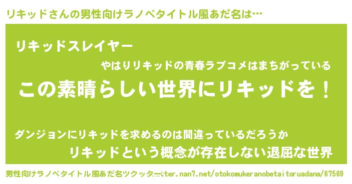 | 胡散臭い通販商品みたいなあだ名 | 『あなたにだけ特別に提供する限定10本のレアな日本酒…その名も「リキッド」』 |
