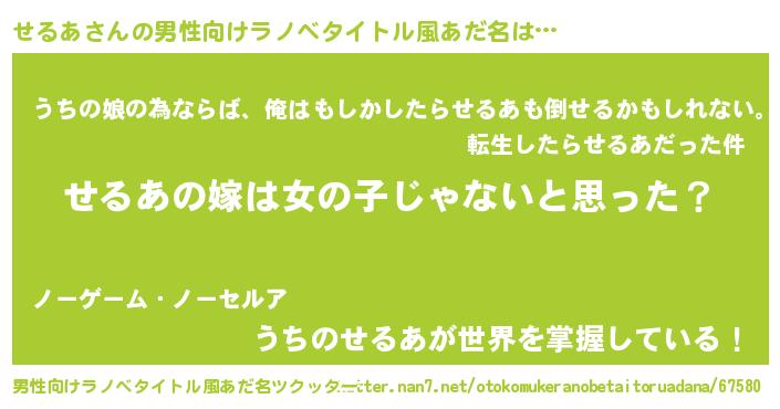 | 女子向けラノベタイトル風あだ名 | 『せるあ様がみてる』『せるあの婚約者』 |