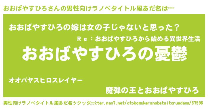 | 女子向けラノベタイトル風あだ名 | 『(仮)おおばやすひろのやんごとなき事情』 |
