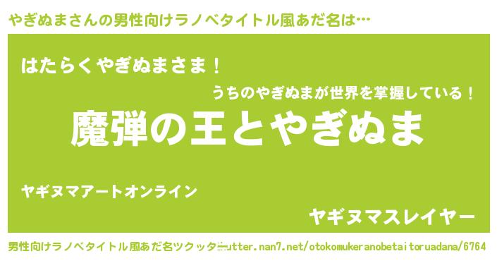 | 女子向けラノベタイトル風あだ名 | 『やぎぬまが死なない童話 林檎のやぎぬまの診療簿』 |