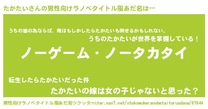 | 女子向けラノベタイトル風あだ名 | 『死神たかたいの再婚』 |