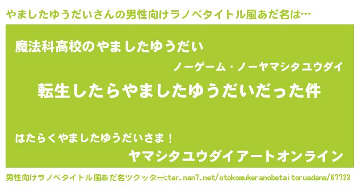 | 女子向けラノベタイトル風あだ名 | 『やましたゆうだいの玉の輿計画!』 |