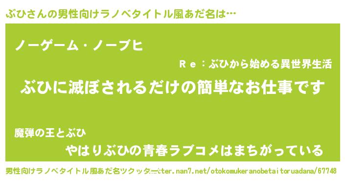 | 女子向けラノベタイトル風あだ名 | 『横柄ぶひと宰相陛下』『死神ぶひの再婚』 |