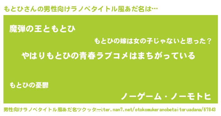 | 女子向けラノベタイトル風あだ名 | 『もとひの雑貨屋さん』『もとひ恋絵巻』 |