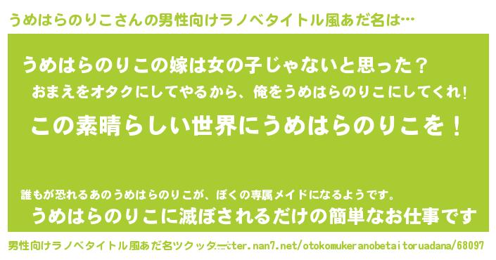 | 女子向けラノベタイトル風あだ名 | 『乙女ゲームの破滅フラグしかない悪役うめはらのりこに転生してしまった…』 |
