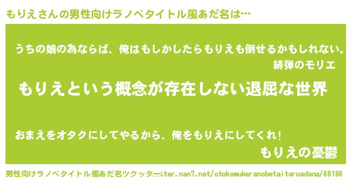 | 胡散臭い通販商品みたいなあだ名 | 『絶対に幸福をもたらす水素水…その名も「もりえ」』 |
