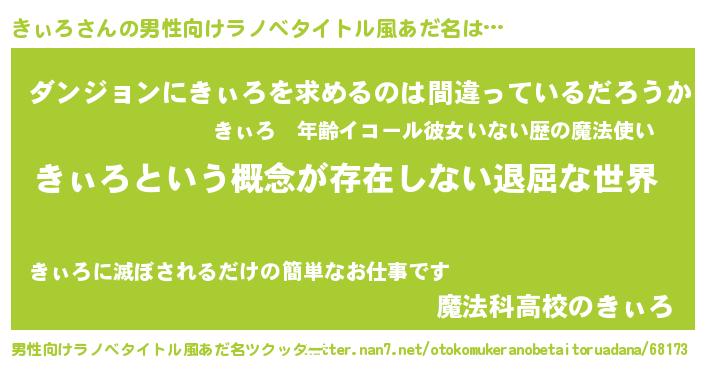 | 女子向けラノベタイトル風あだ名 | 『異世界で失敗しない100のきぃろ』 |